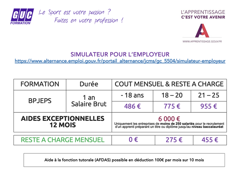 • OPCO du Sport (AFDAS) : 100 euros par mois pendant les 10 premiers mois, soit 1 000 euros.