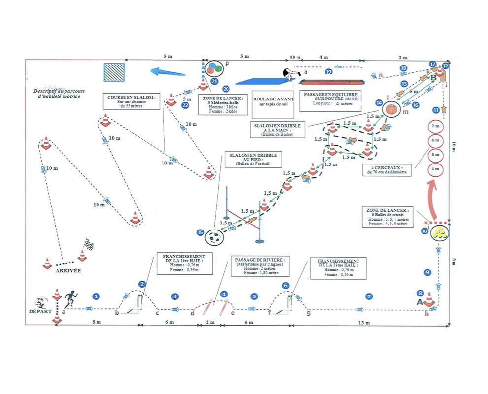 Palier 6 pour les femmes et palier 8 pour les hommes >bande son Luc léger Épreuve 2 : test de motricité : > document descriptif de l’épreuve |